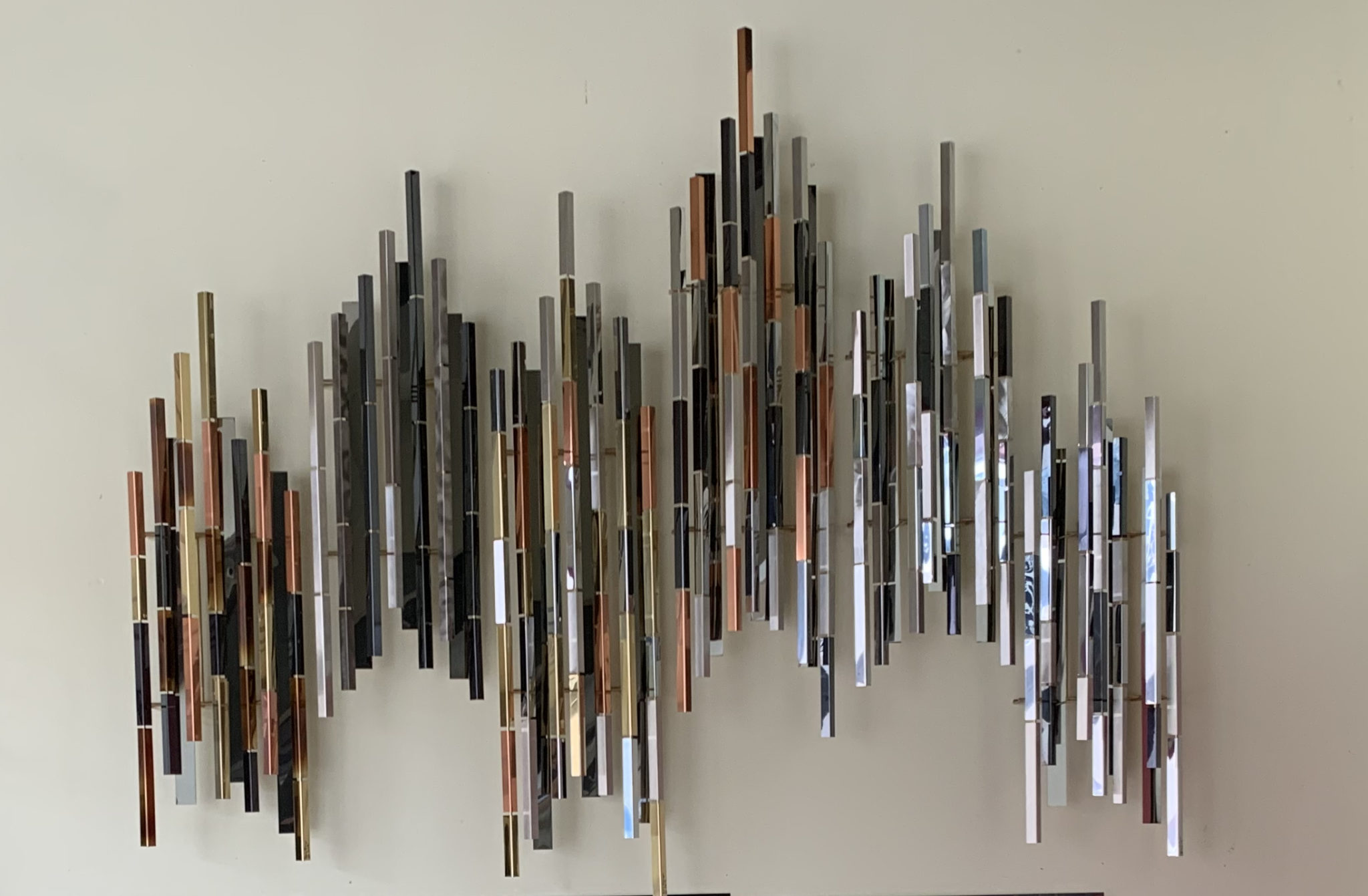 The Kaleidoscope is a contemporary modular metal art design that incorporates angled reflective plates that are displayed on vertical rods. This piece can be viewed from any location in the room and changes in appearance depending on the light that it is given.